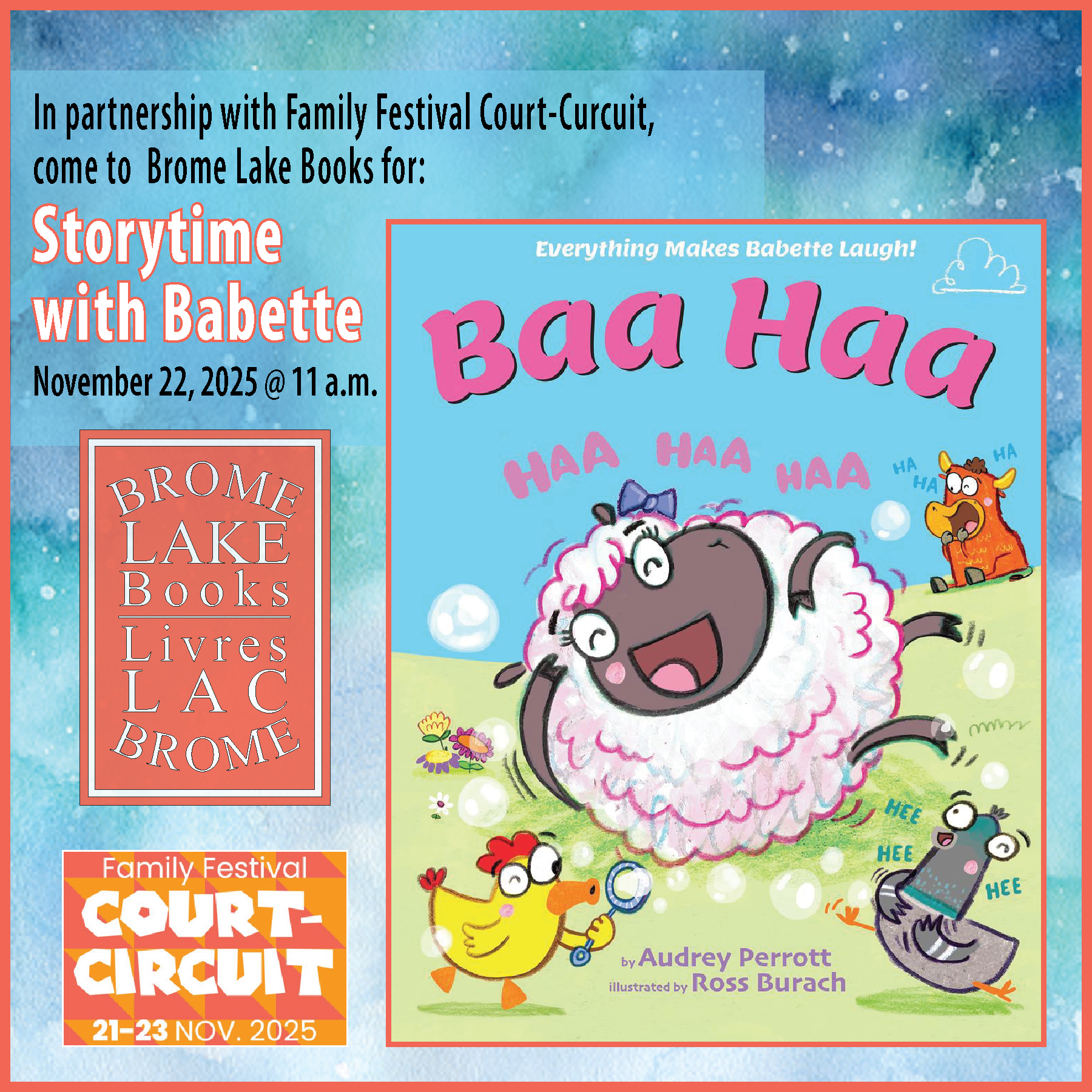 on Saturday November 22 at 11 a.m., in conjunction with the town's Family Festival Court-Circut, there was be a special FREE Storytime event at Brome Lake Books, featuring SHEILA QUINN reading BAA HAA by Audrey Perrott and Ross Burach.