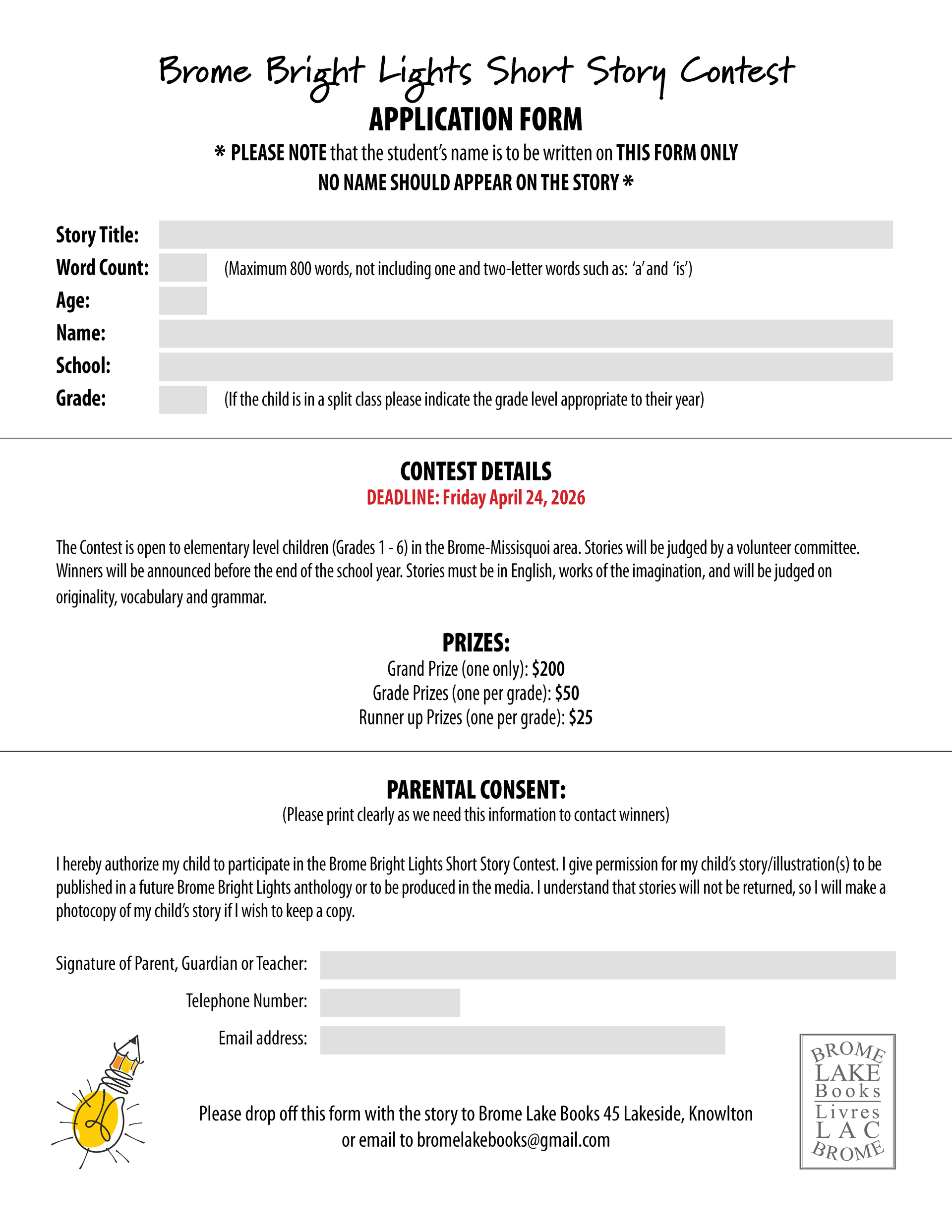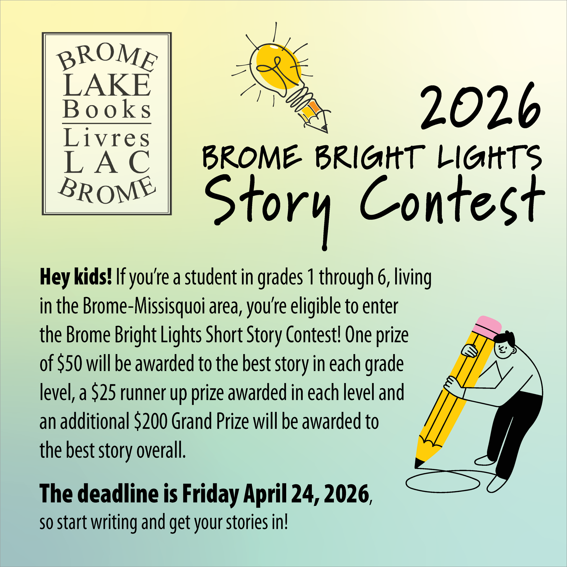 The contest is open to elementary-level children (grades 1 – 6) in the Brome-Missisquoi area. The deadline for submissions is Friday, April 24, 2026. Stories must be less than 800 words. They must be works of the student's imagination and will be judged on originality, good storytelling, vocabulary, and grammar.