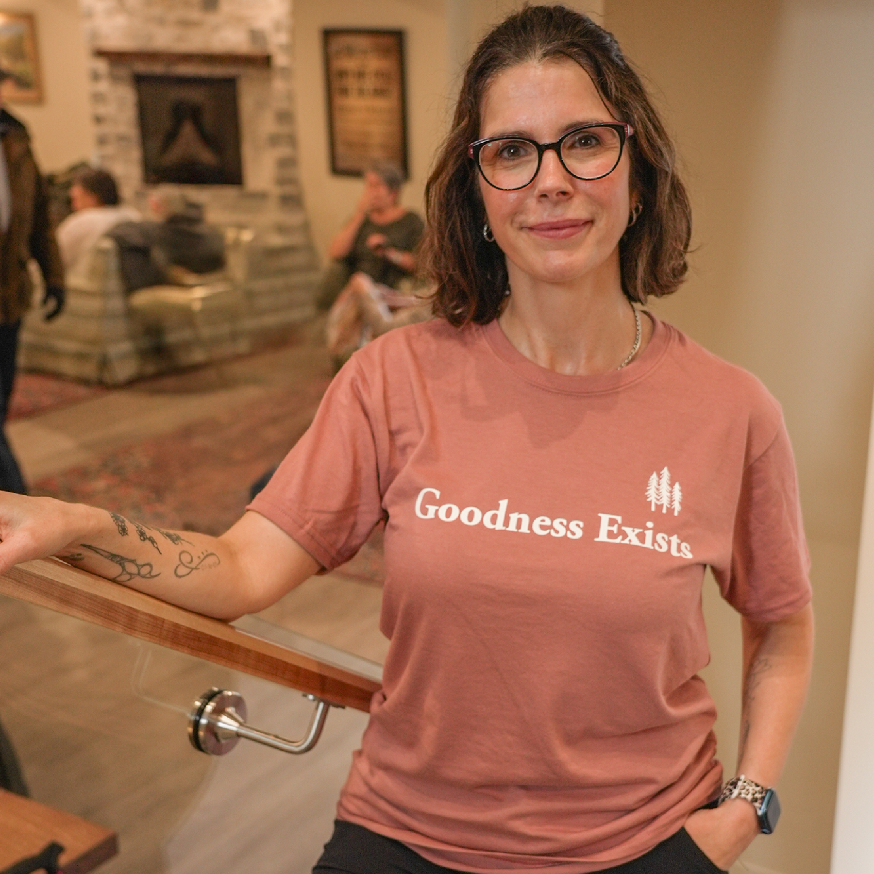 "If you take only one thing away from any of my books, I'd like it to be this: Goodness exists." -Louise Penny. The Goodness Exists short sleeved T-Shirt sells for $35 each and comes in 5 unisex sizes: S, M, L, XL and 2XL. It is Dusty Pink with white writing on the front.